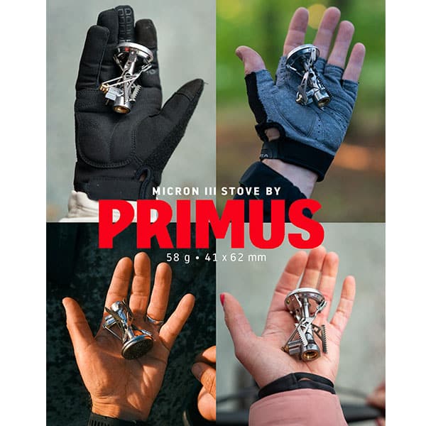 Micron III Piezo is a sit-on-top gas stove with a matchstick-style Piezo igniter and foldable pot supports. It comes with a durable nylon storage bag. Pair with a smaller pot set (sold separately). Micron III Piezo has no regulator and gas is not included – use with Primus Power Gas, Summer Gas or Winter Gas.