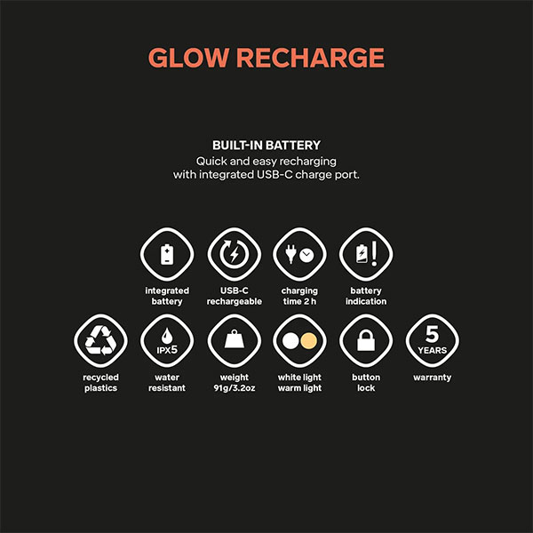 Use Glow Recharge’s cool white light when setting up camp, cooking, and organising, and switch to the warm, cosy light when relaxing, socialising, and reading. The lantern offers four brightness levels, ranging from a battery-saving 5 lumen to a powerful 350 lumen. Glow Recharge features an integrated 2050 mAh Li-Po battery with a USB-C charging port (charging cable not included).